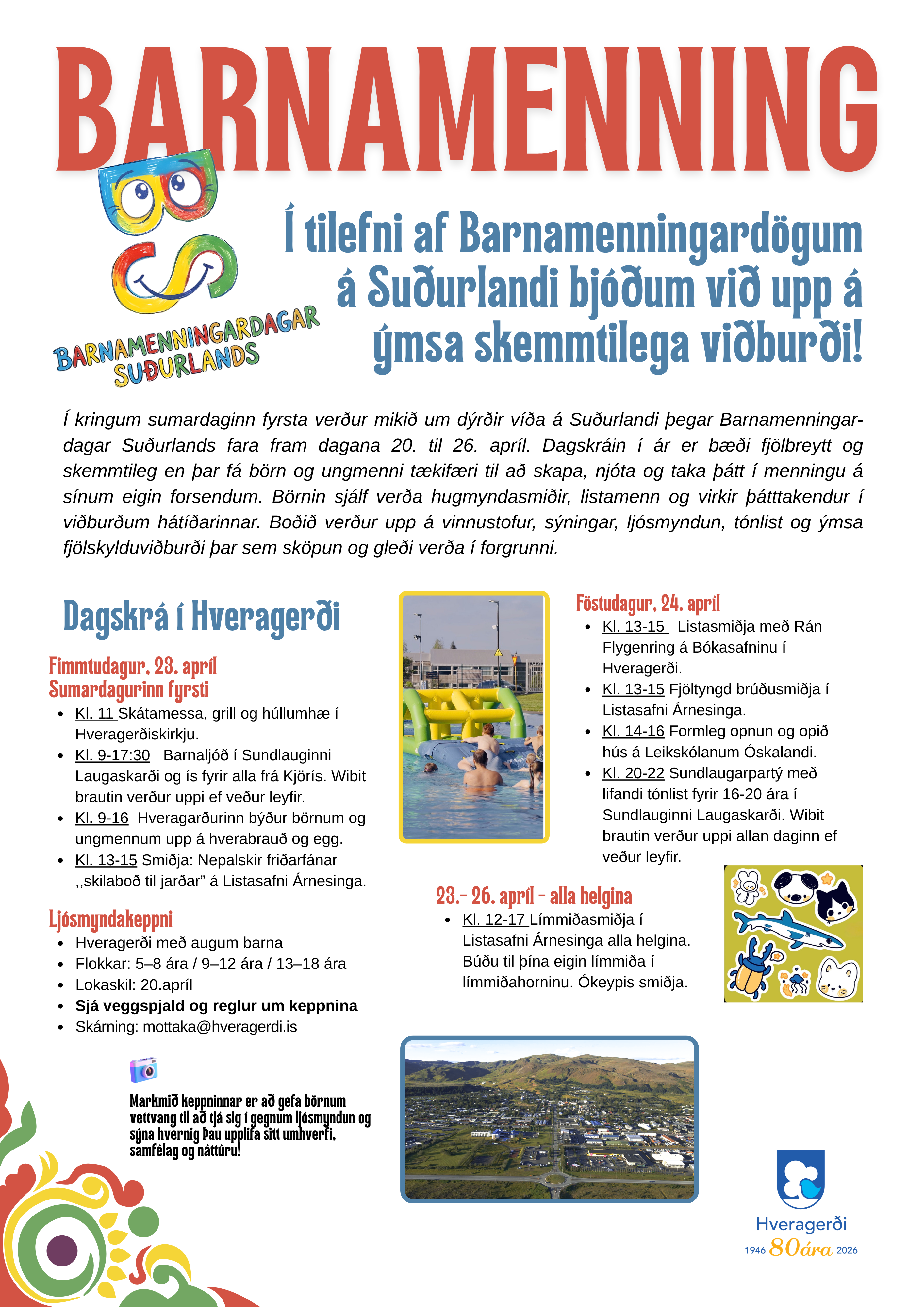 Barnamenningardagar verða haldnir á Suðurlandi dagana í kringum sumardaginn fyrsta. Hér í Hveragerði nær dagskráin yfir dagana 23. - 26. apríl eins og sjá má á meðfylgjandi dagskrá.