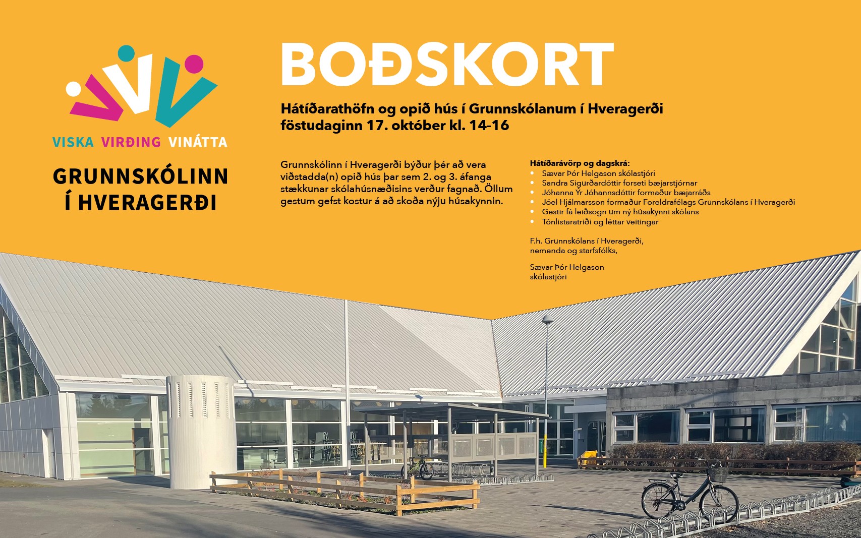 Grunnskólinn í Hveragerði býður þér að vera viðstadda(n) opið hús þar sem 2. og 3. áfanga stækkunar skólahúsnæðisins verður fagnað. Öllum gestum gefst kostur á að skoða nýju húsakynnin.