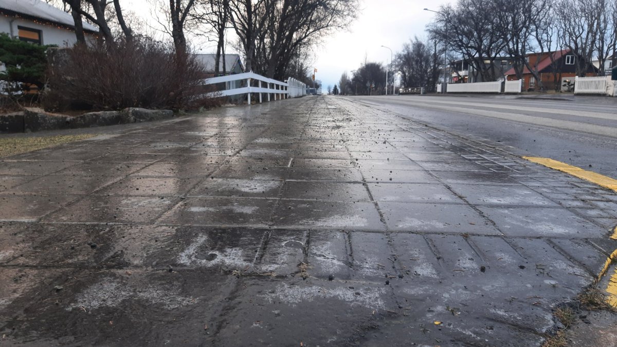 Unnið er á fullum krafti að sanda gangstéttir bæjarins til að bæta ástandið.