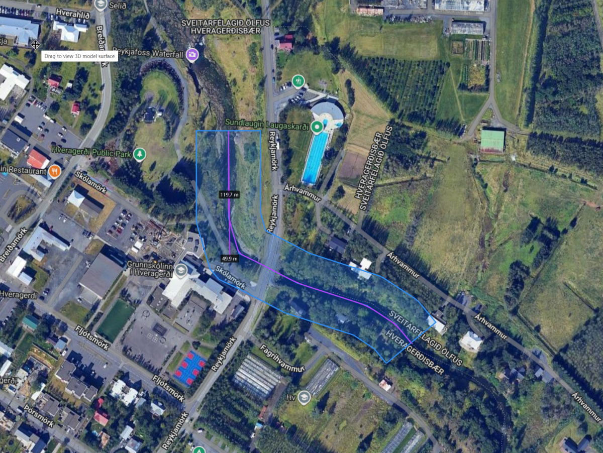 Dróna verður flogið meðfram Varmá frá listigarðinum.